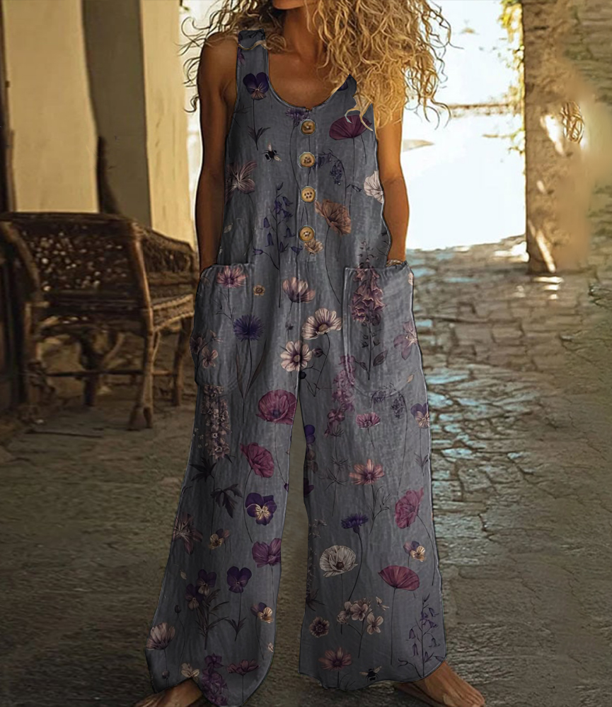 Vintage Floral Art Print Casual Wide Leg Jumpsuit