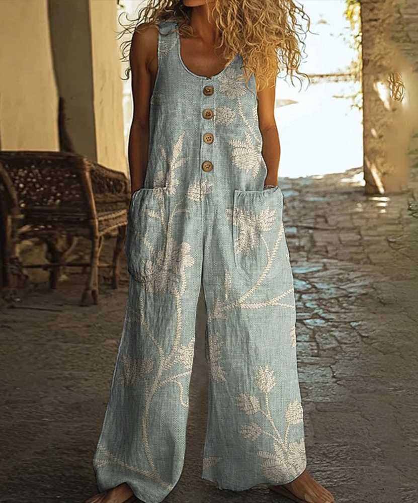 Vintage Floral Art Print Casual Wide Leg Jumpsuit
