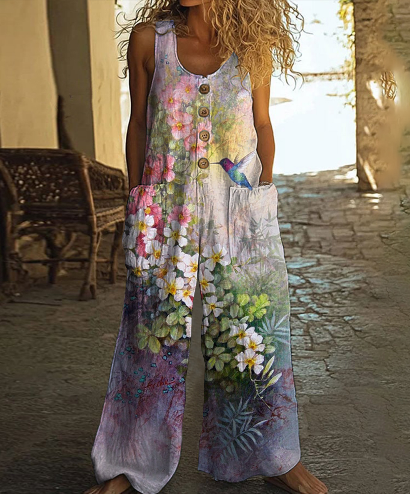 Vintage Floral Hummingbird Art Print Casual Wide Leg Jumpsuit