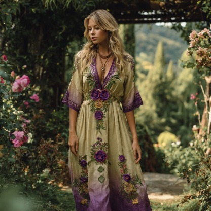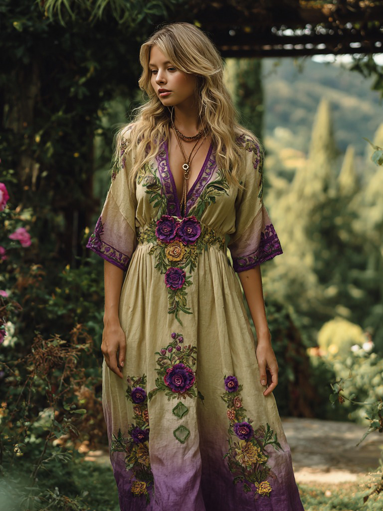 Vintage Gradient Purple Floral Embroidered V Neck Linen Blend Maxi Dress