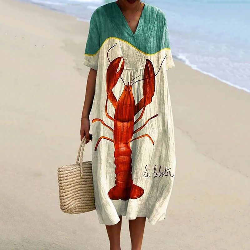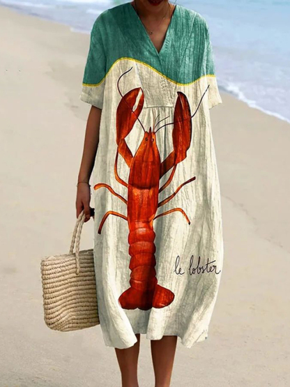 Vintage Shrimp Art Print Casual Midi Dress