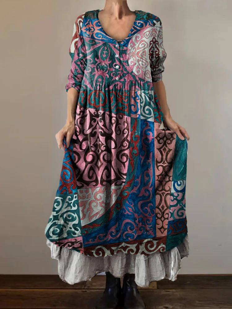 Women's Abstract Irregular Pattern Art Print V-Neck Button Pocket Cotton Dress