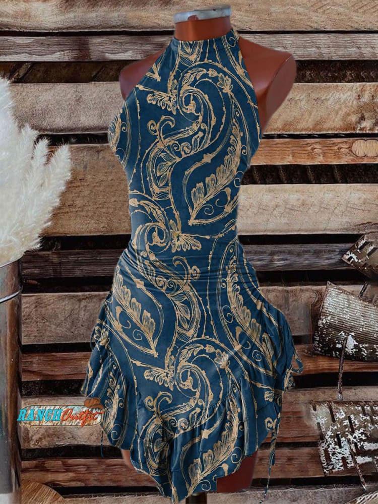 Women's Blue Floral Pattern Print Halter Neck Dress