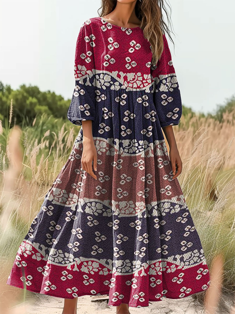 Women's Floral Contrast Print Flowy Crew Neck Pocket Cotton Dress