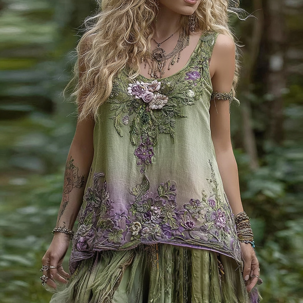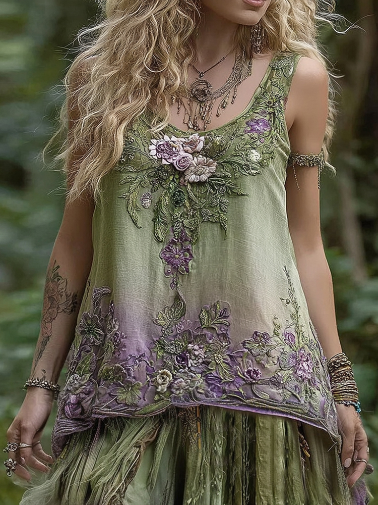 Women's Floral Embroidered Crew Neck Linen Blend Tank Top