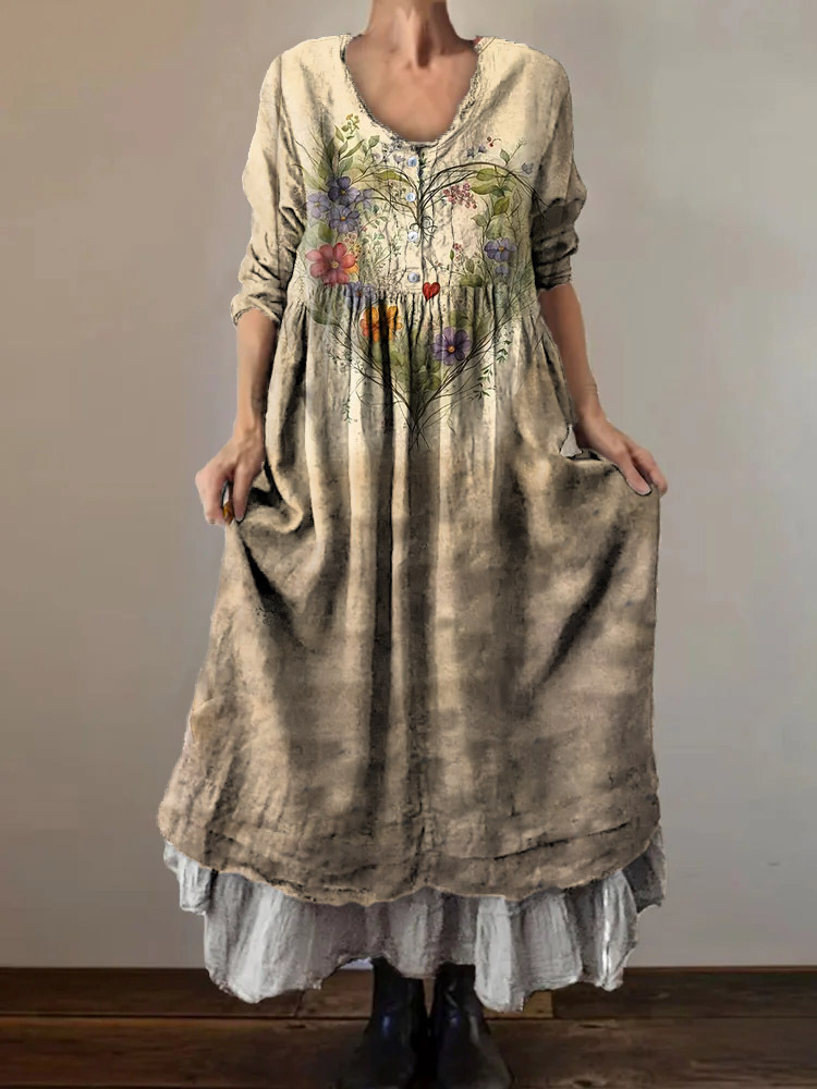 Women's Floral Heart Pattern Art Print V-Neck Button Pocket Cotton Dresses