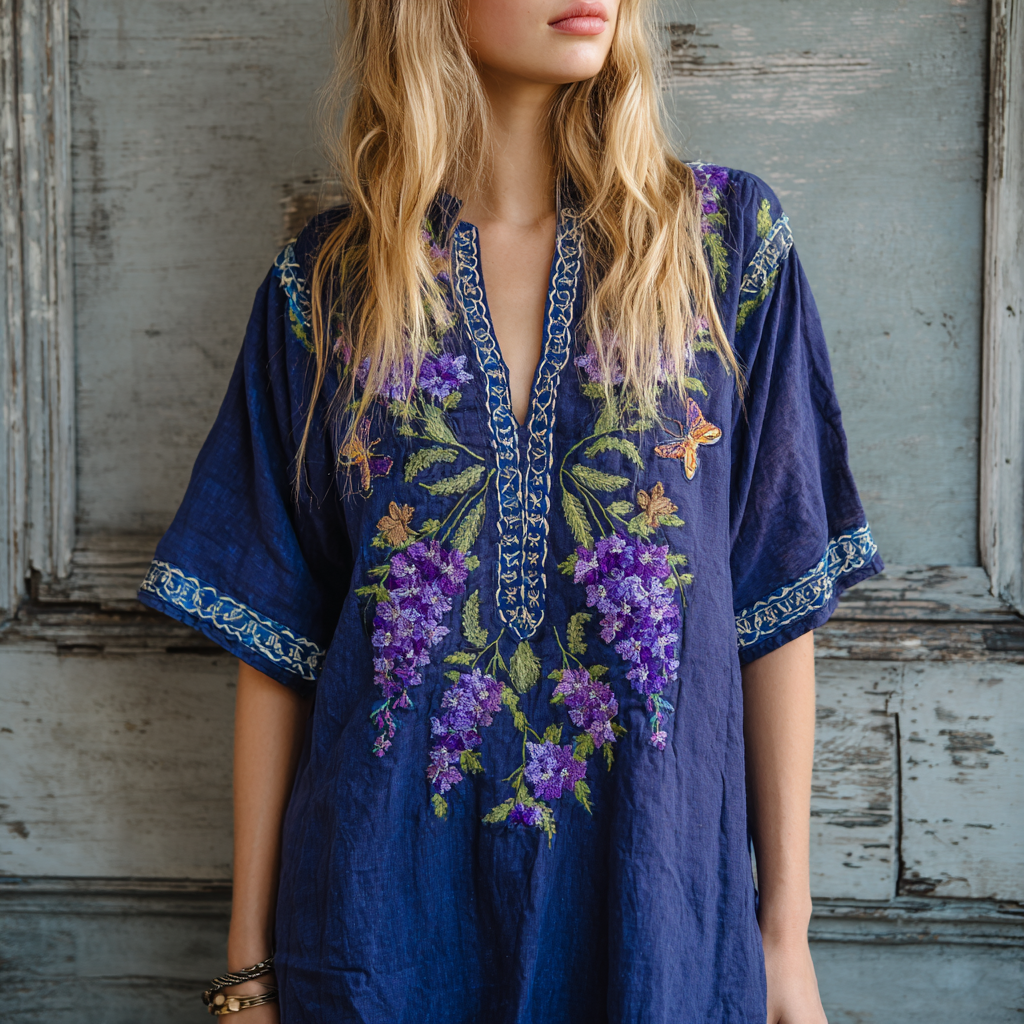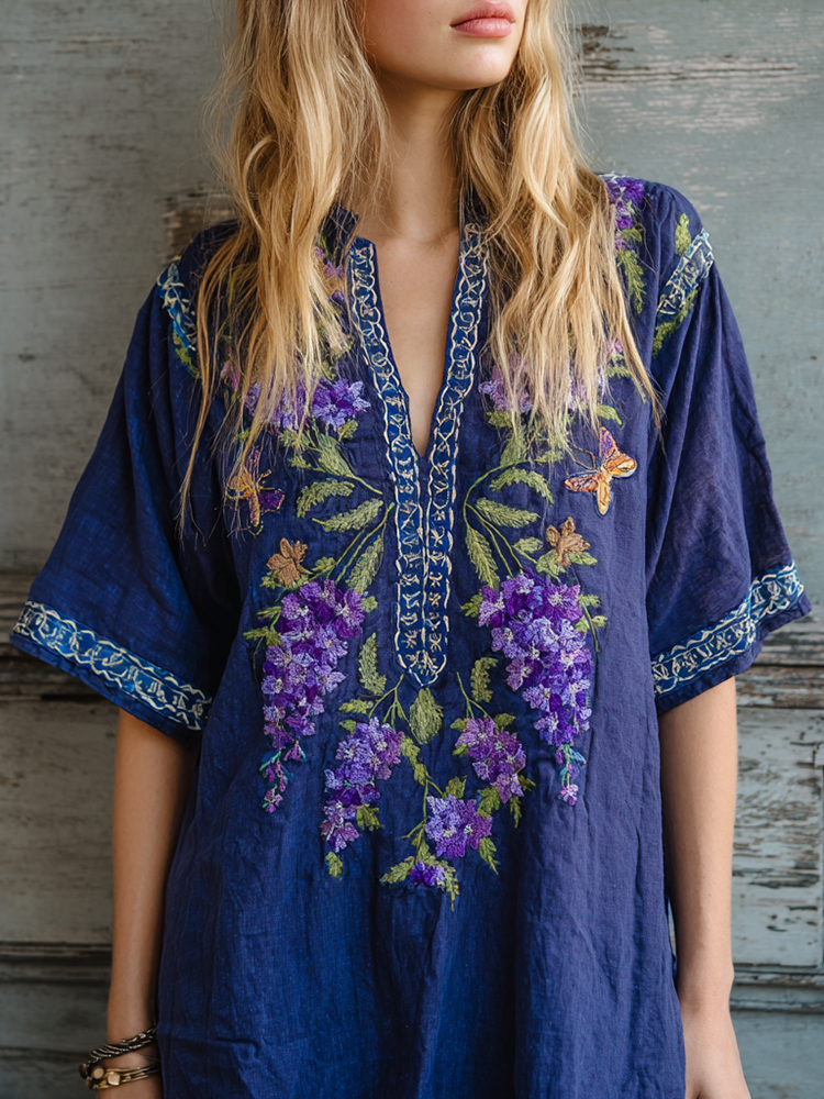 Women's Lavender Embroidery Linen V-neck Shirt