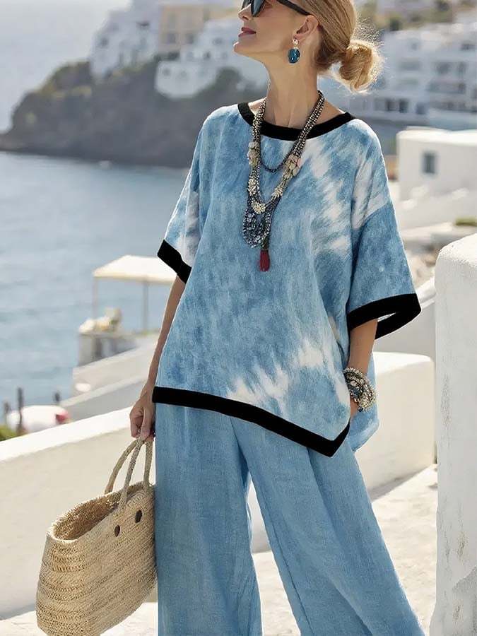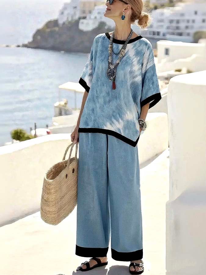 Women'S Loose Printed Contrast Color Wide Leg Pants Set