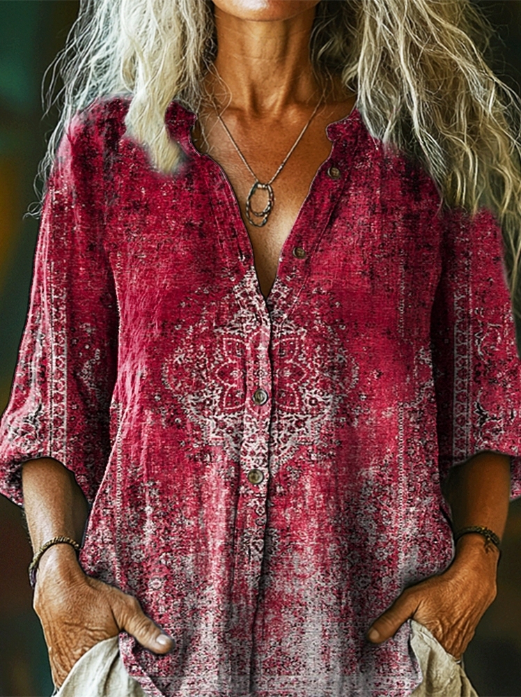 Women's Retro Ethnic Gradient Totem Art Print Casual Cotton Linen Shirt