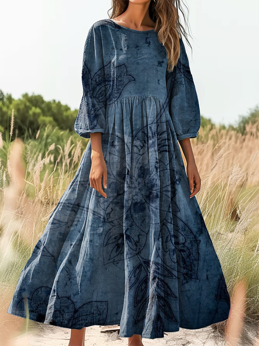 Women's Vintage Floral Art Print Flowy Cotton Crew Neck Dress