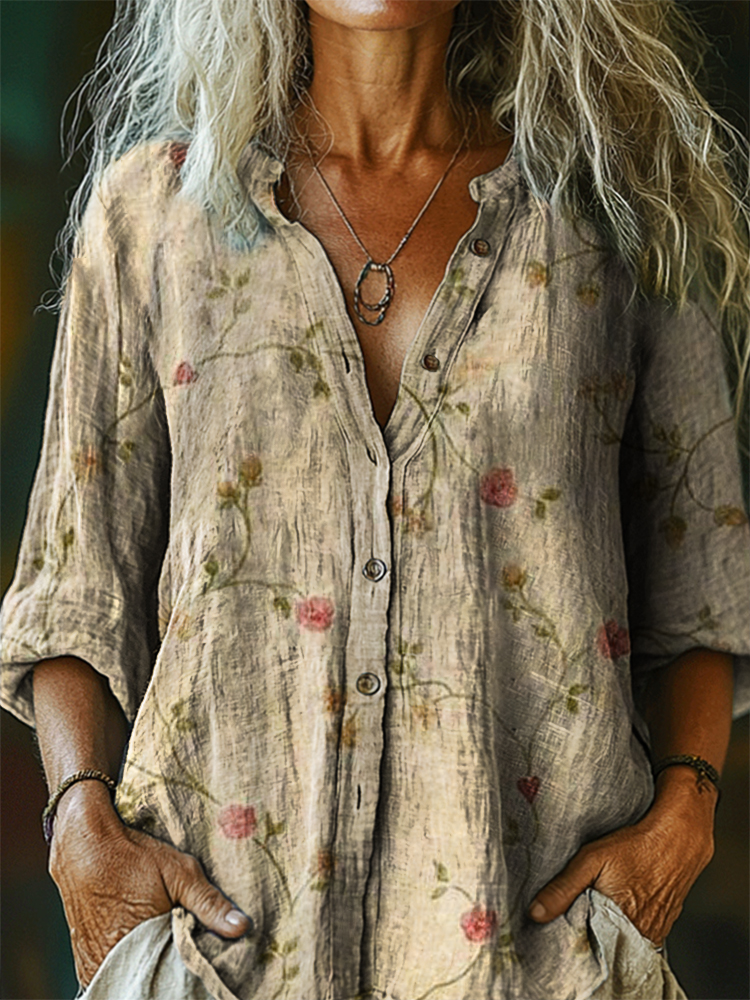 Women's Vintage Floral Tattoo Pattern Art Print Linen Cotton Casual Shirt