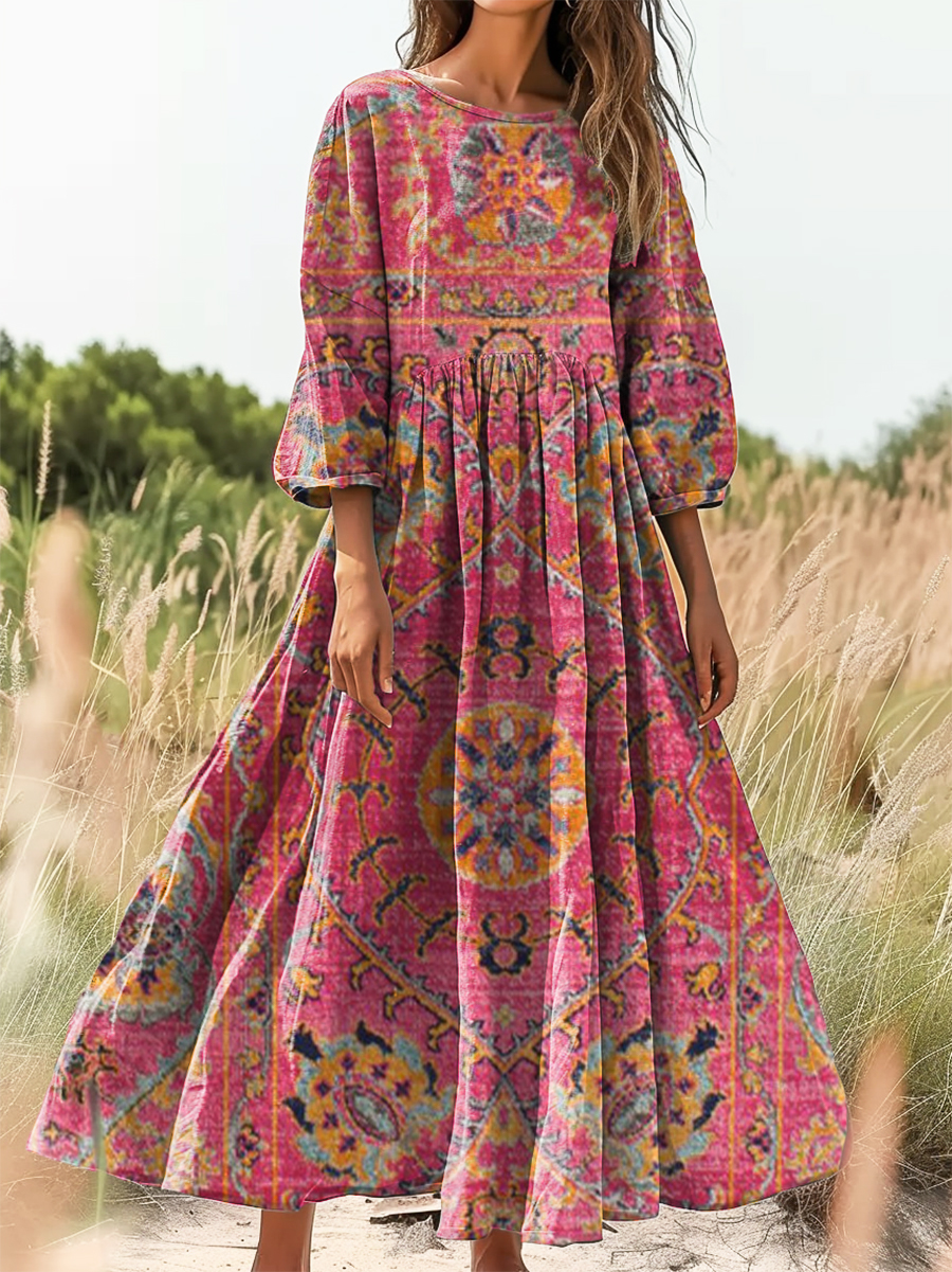 Women's Vintage Floral Totem Art Print Flowy Cotton Crew Neck Dress