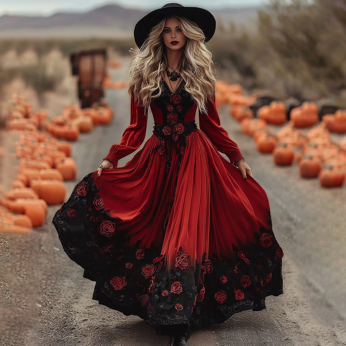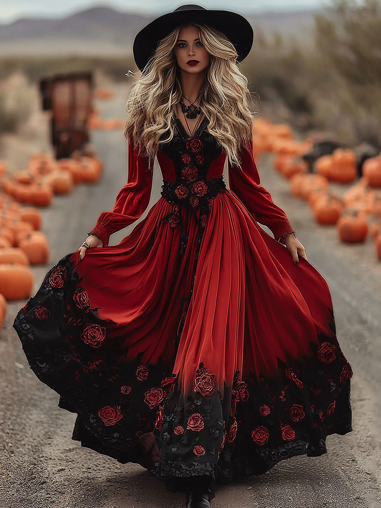 Women's Vintage Halloween Black Roses Art Comfy Velvet Maxi Dress