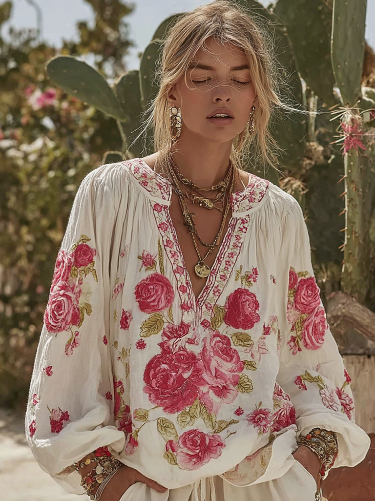 Women's Vintage Rose Floral Linen Long Sleeve T-shirt