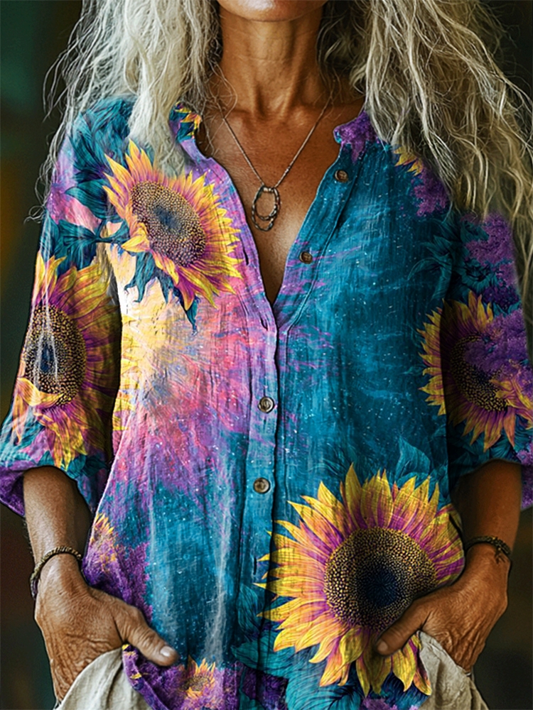 Women's Vintage Sunflower Pattern Art Print Casual Cotton Linen Shirt