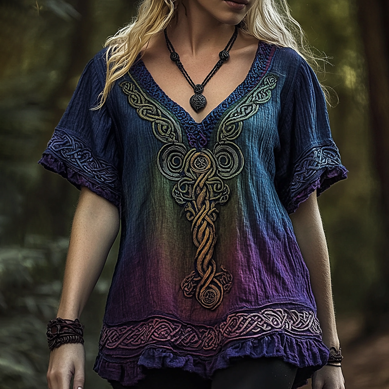 Women's Vintage Viking Celtic Knot Gradient Art Linen T Shirt
