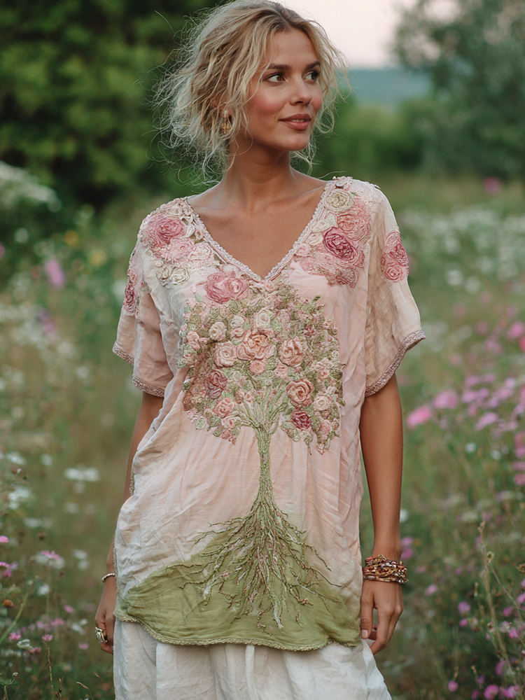Vintage Embroidered Tree Of Life Flowers V-neck T-shirt