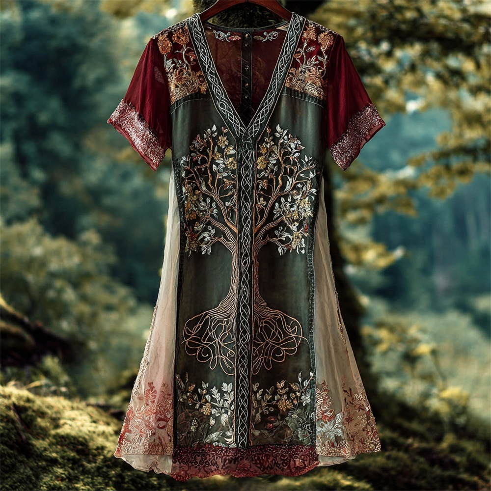 Viking Tree Of Life Embroidered Boho Women's V-neck Short Sleeve Mini Dress