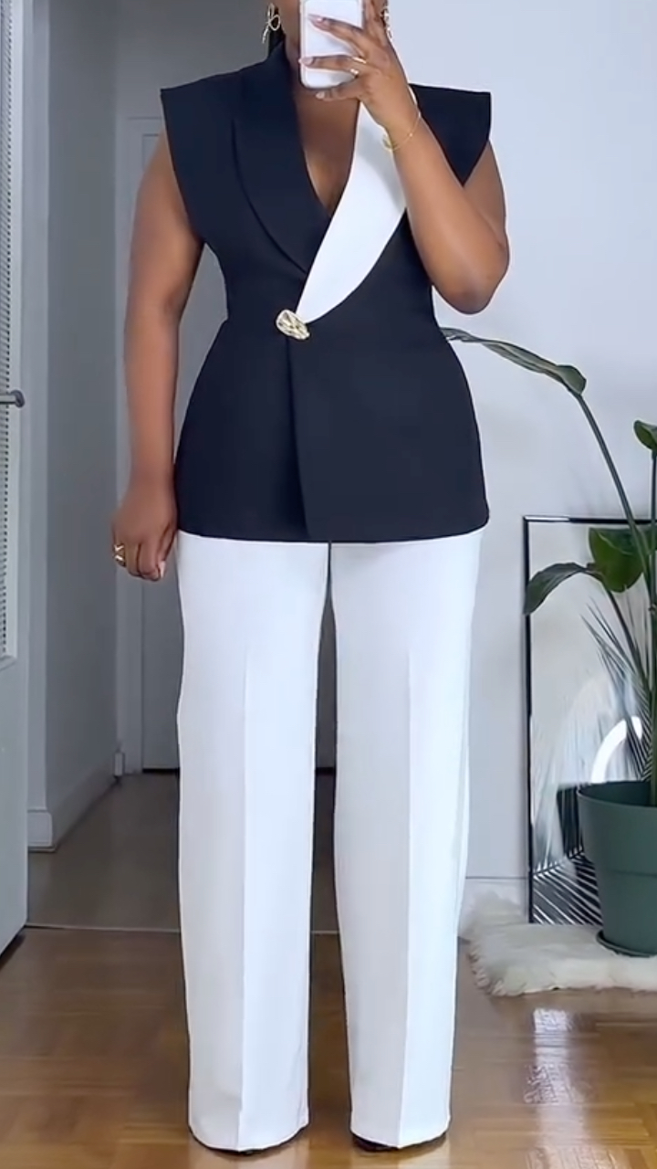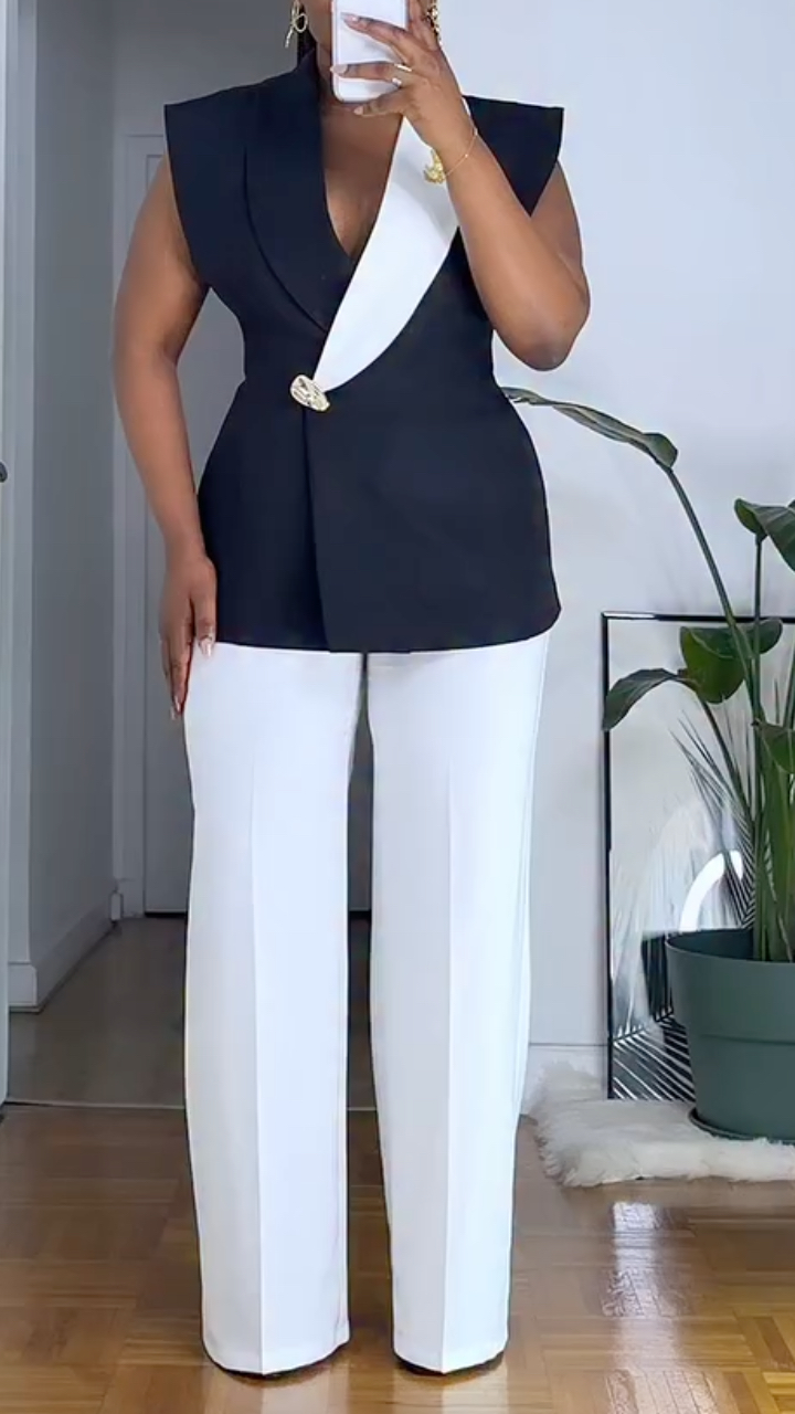 Color-Blocked Sleeveless Fitted Waist Top & Wide-Leg Pants Suit