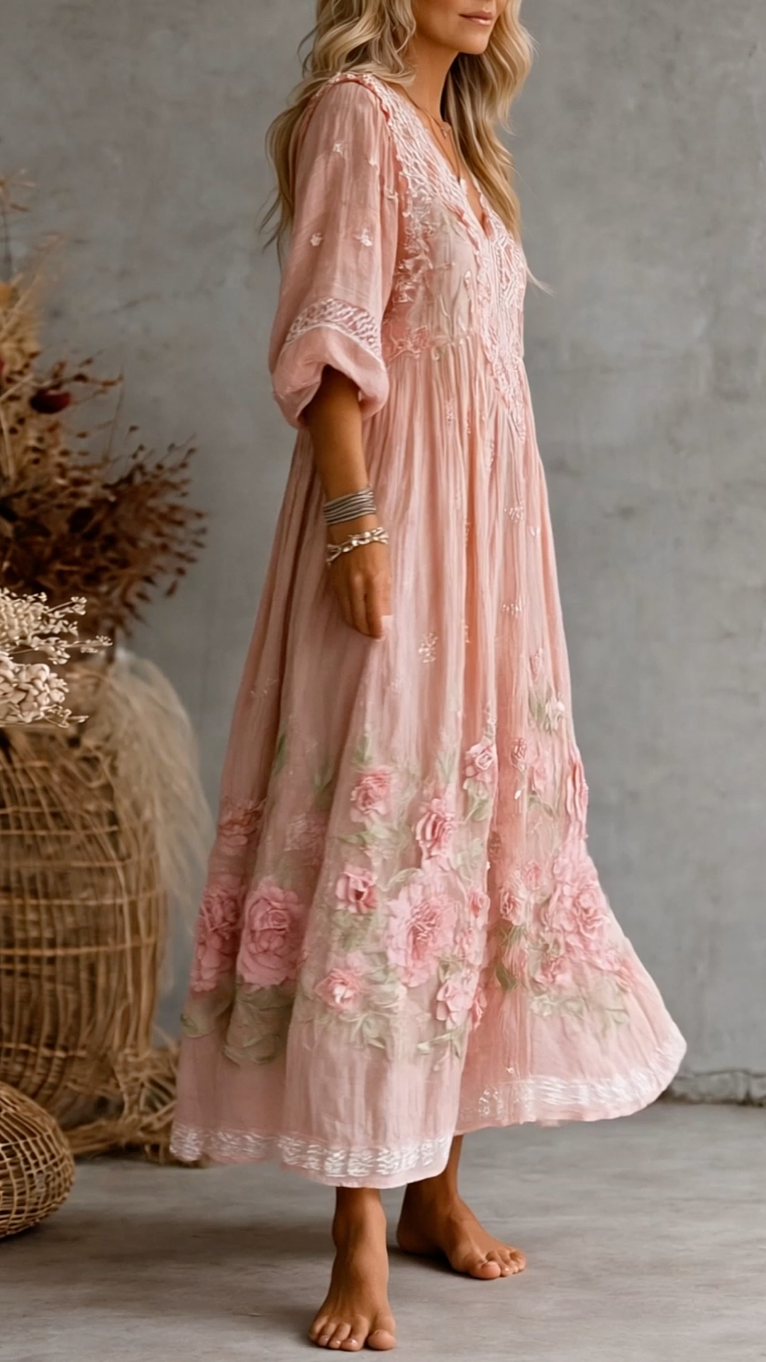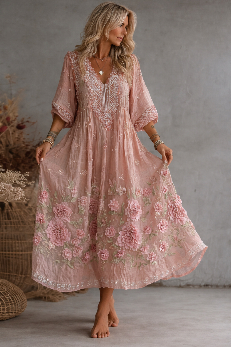 Pink 3D Embroidered Lace V-Neck Long Dress