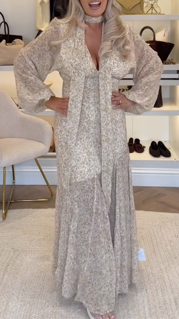Women's Satin V-Neck Dress + Chiffon Cardigan Elegant Set