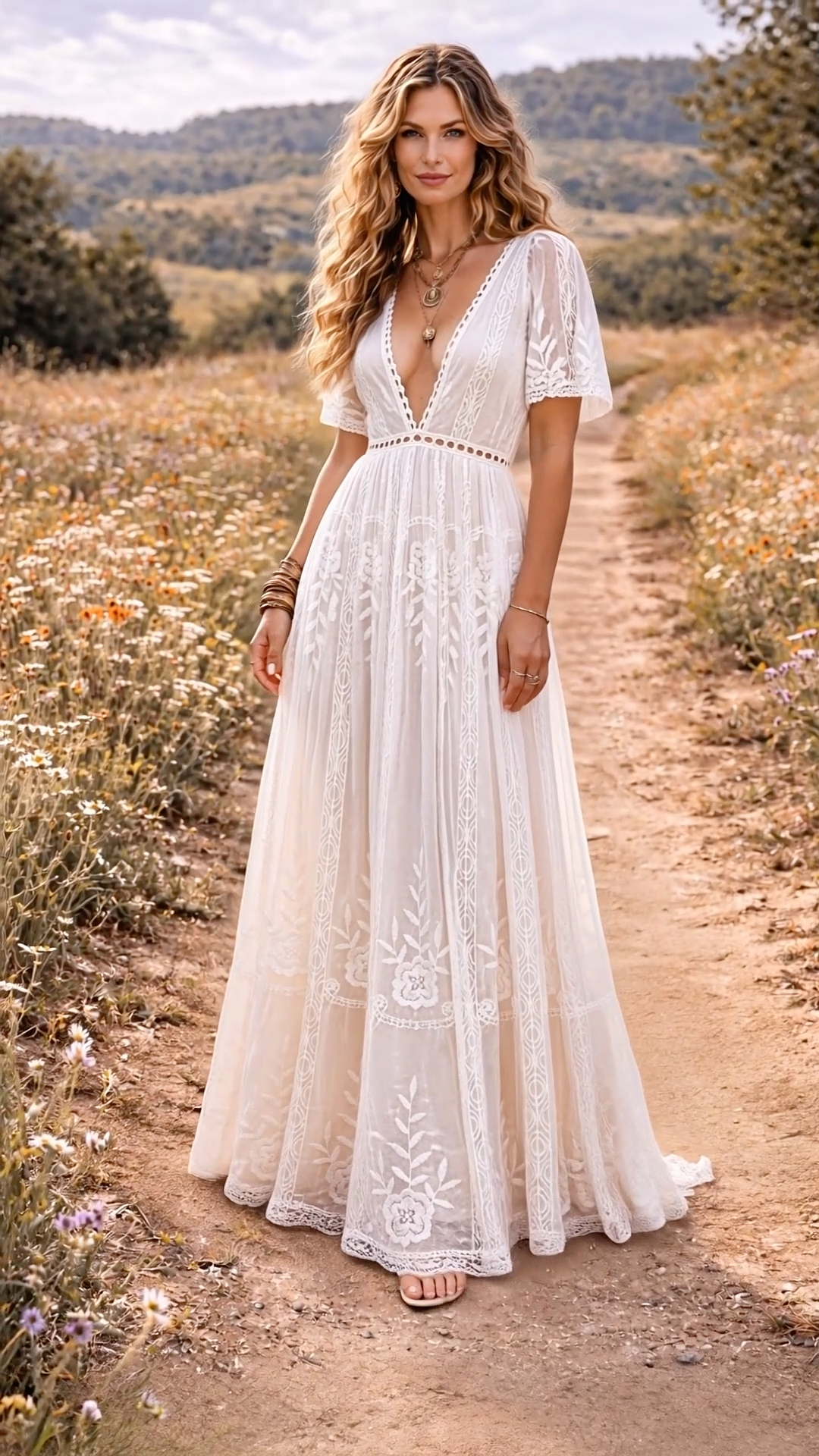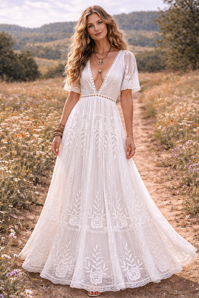 Lace Deep V-Neck Short Sleeve High Waist A-Line Maxi Dress