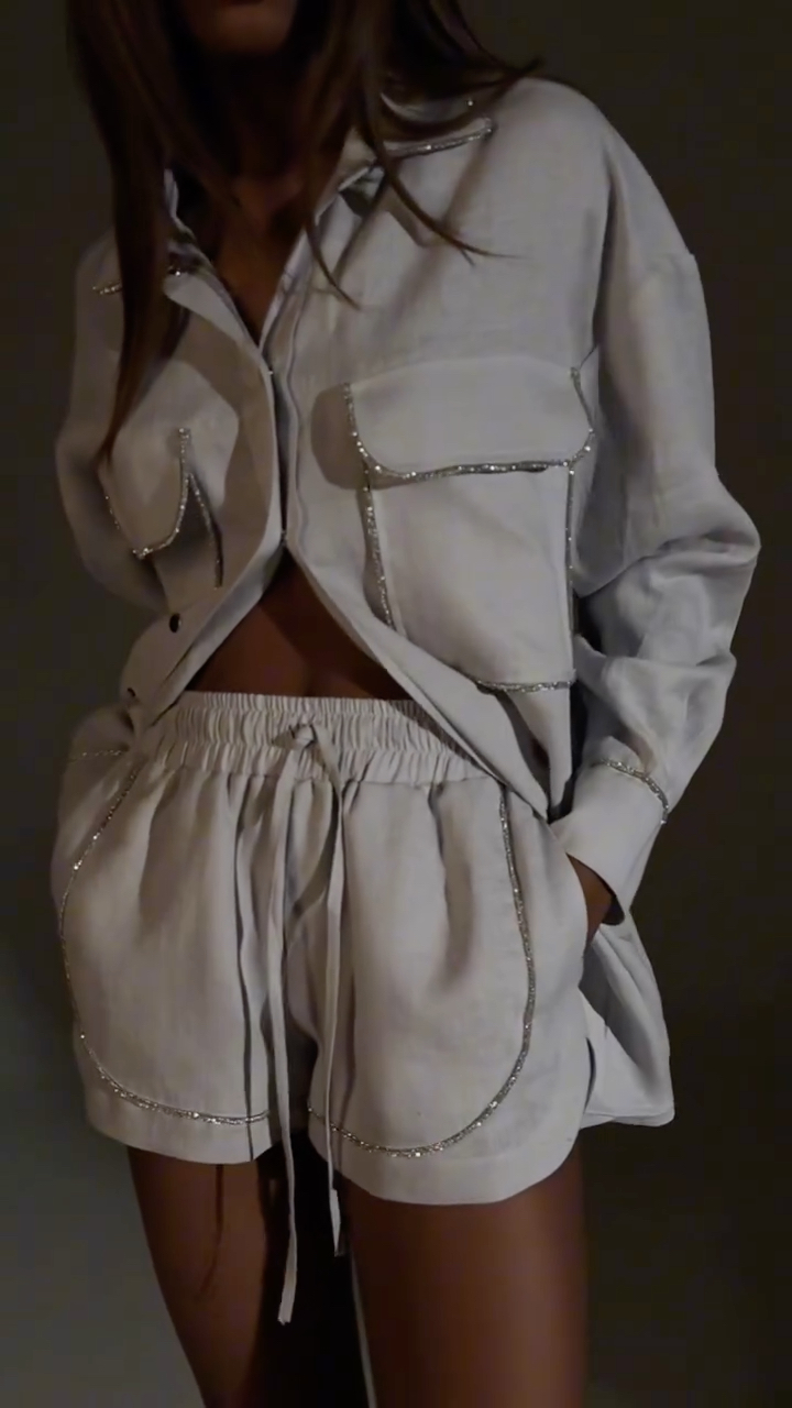 Rhinestone Embellished Denim Crop Top Shorts Three Piece Set