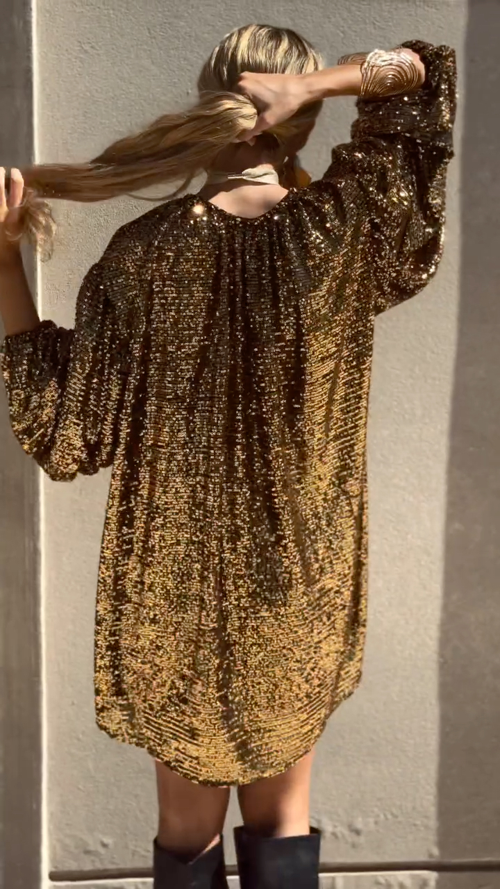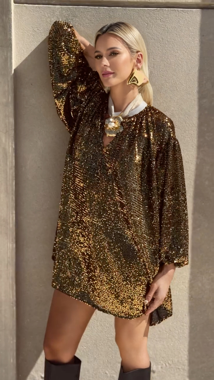 Gold V-Neck Sequined Party Dress