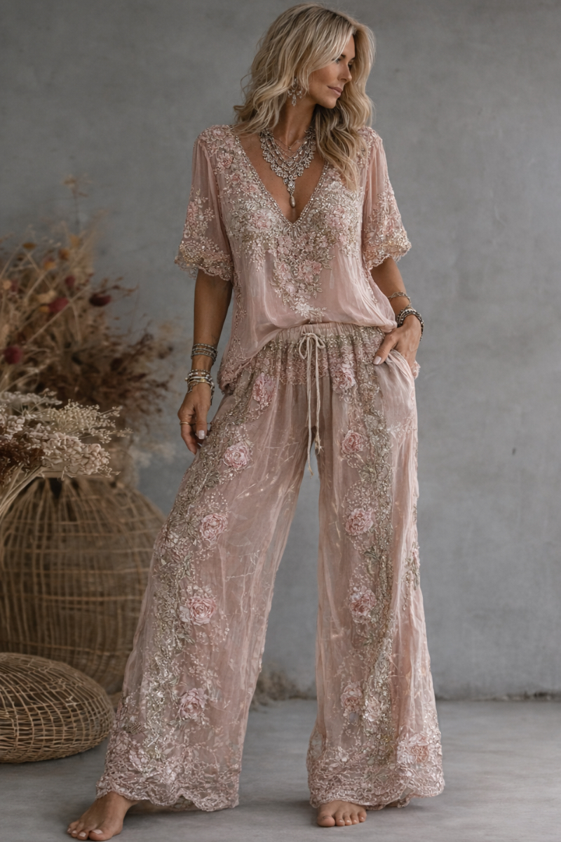 Floral Embroidered V-Neck Top High Waist Wide Leg Pants Two Piece Set