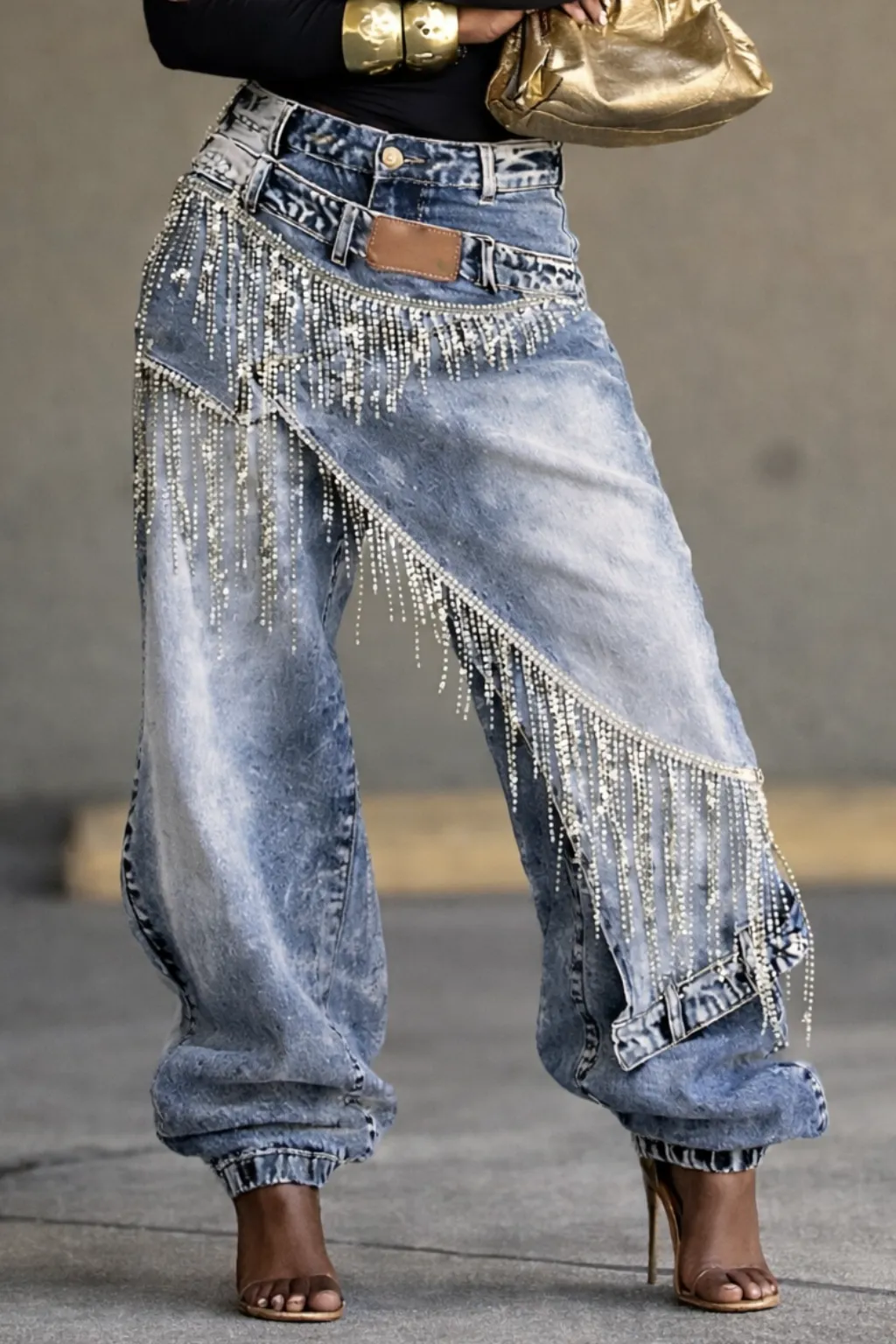 Rhinestone Fringe Double Waistband Wide Leg Denim Jeans