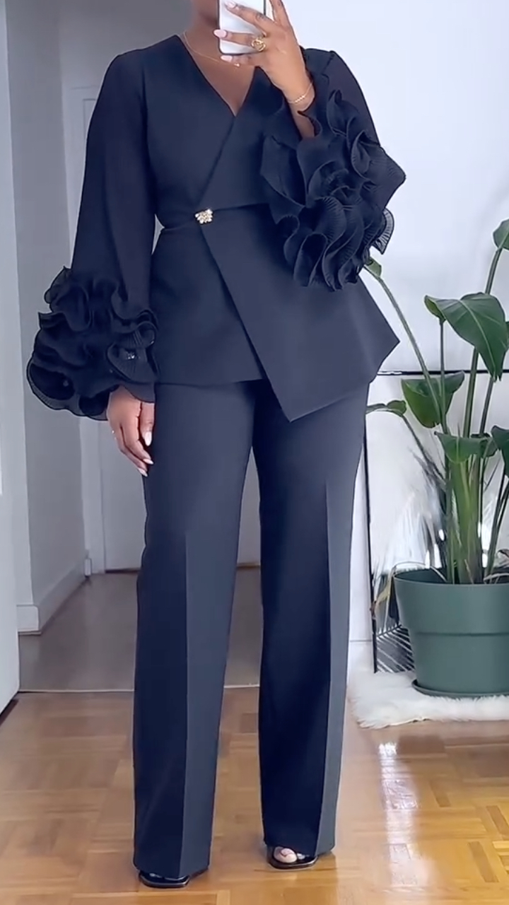 V-Neck Fitted Waist Ruffled Long Sleeve Top & Trousers Set