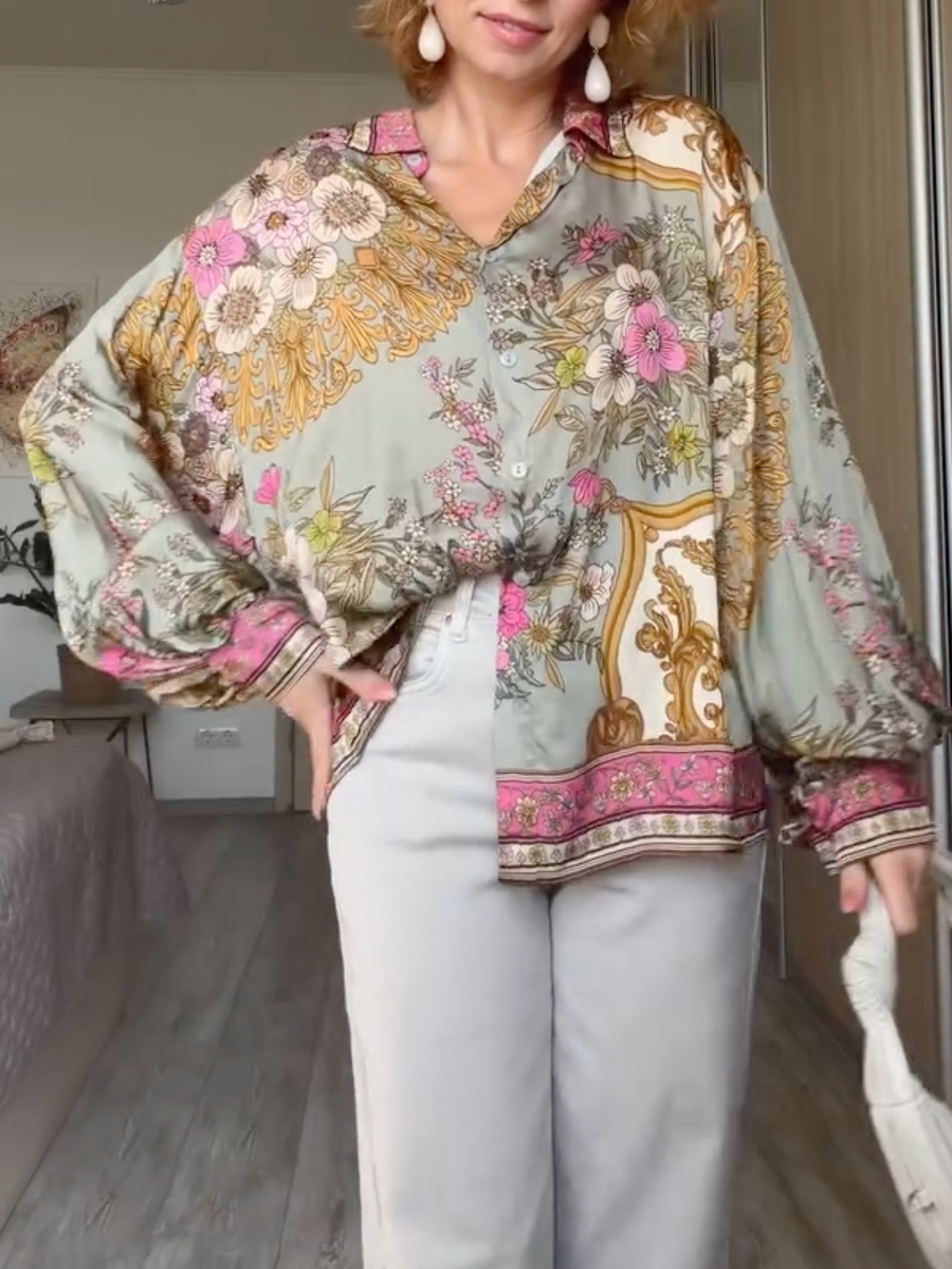Vintage Floral Print Lantern Sleeve Button Down Chiffon Blouse