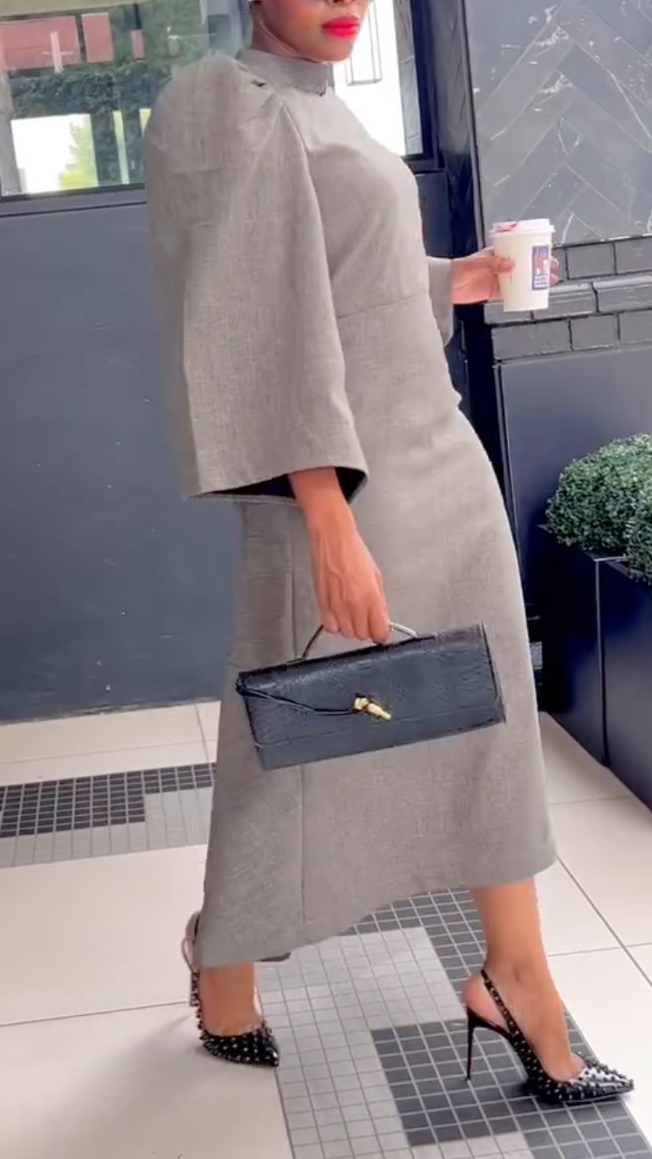 Gray Stand Collar Tie Waist Blazer Pencil Skirt Suit