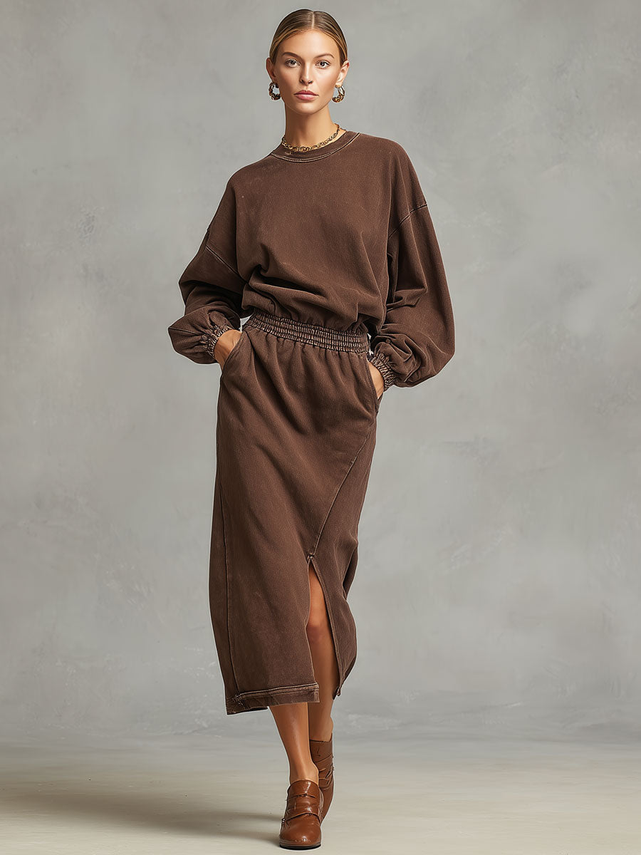 Sporty Retro Chocolate Washed Cotton Slit Midi Dress