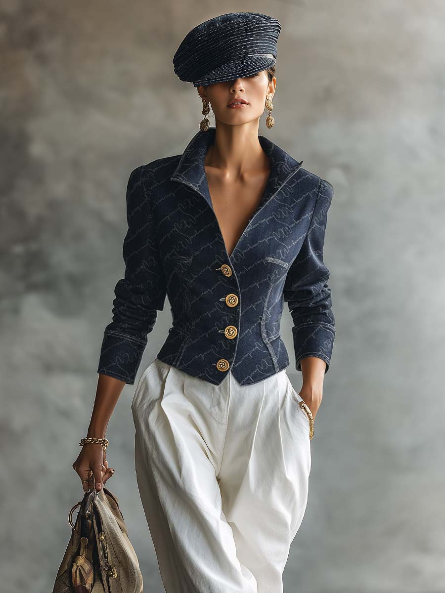 Vintage Fashion Lapel Front-button Printed Dark Blue Denim Short Jacket