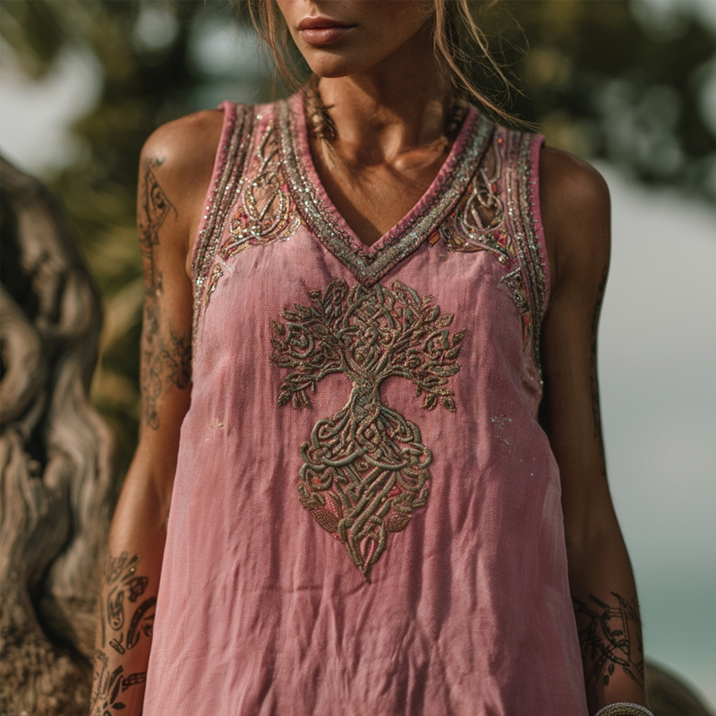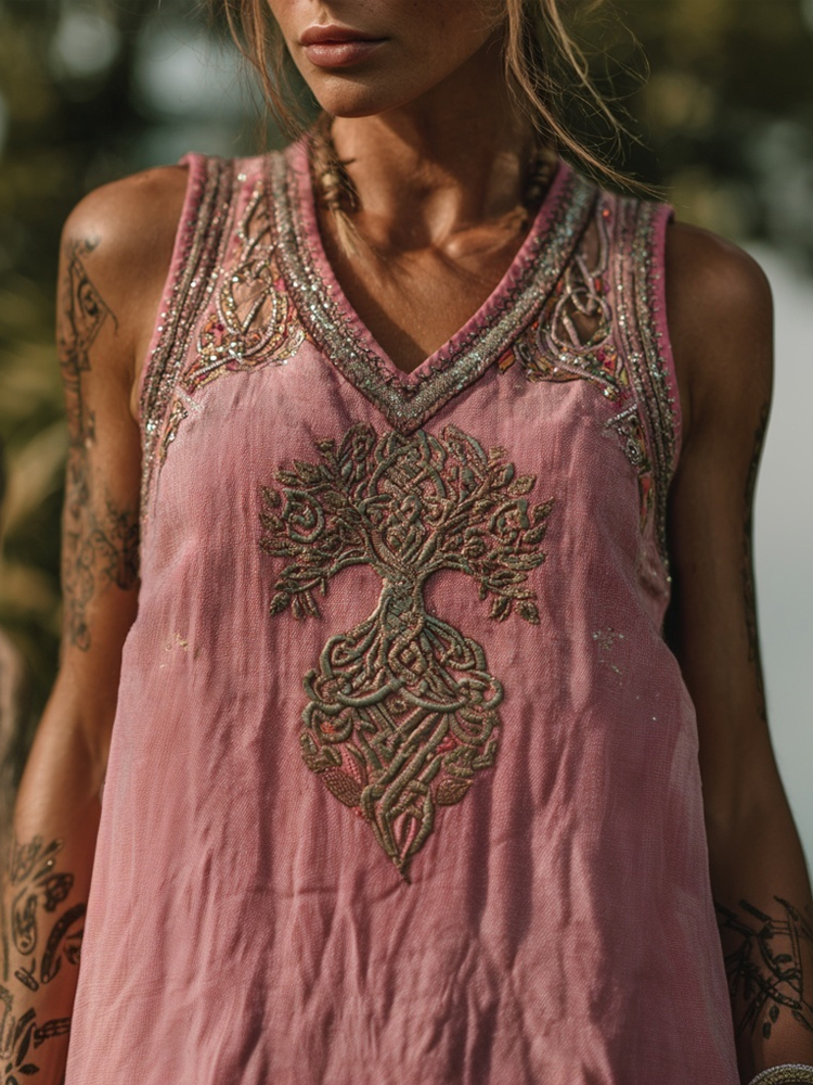 Celtic Tree Of Life Embroidered V Neck Pink Linen Tank