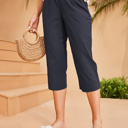 Elastic Waist Capri Pants, Casual Solid Versatile Pants With Pockets, Women's Clothing