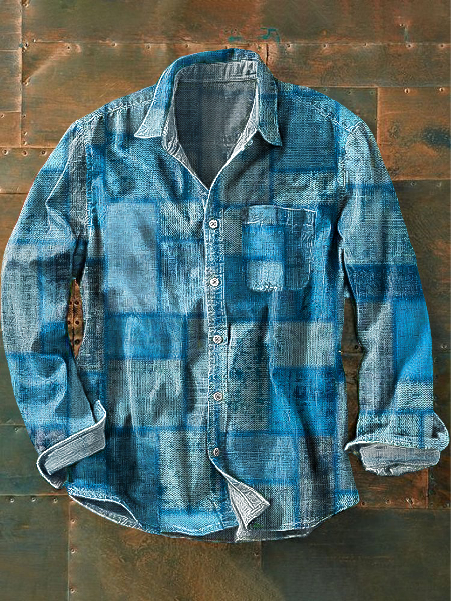 Men's Vintage Trompe l'oeil Plaid Art Print Long Sleeve Pocket Shirt