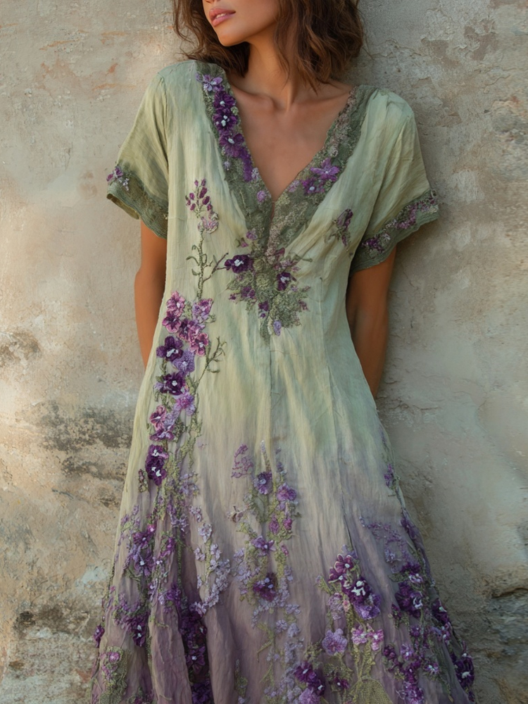 Purple Floral Embroidered Gradient Vintage Linen Maxi Dress