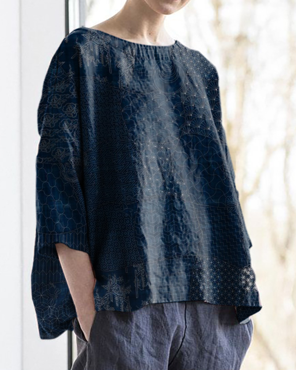 Retro Sashiko Print Round Neck Cotton and Linen Loose Top