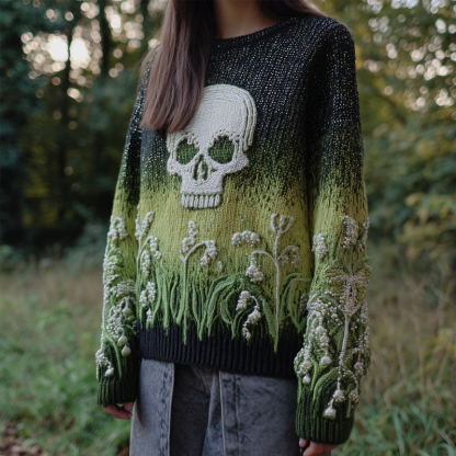 Retro Lily Of The Valley & Skull Embroidered Cozy Knit Sweater