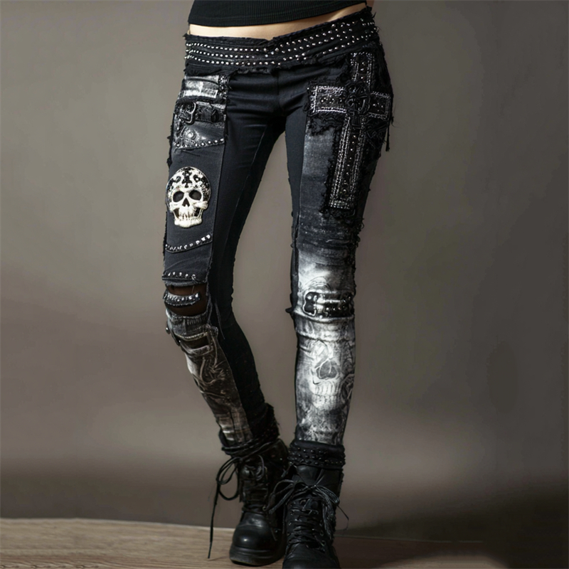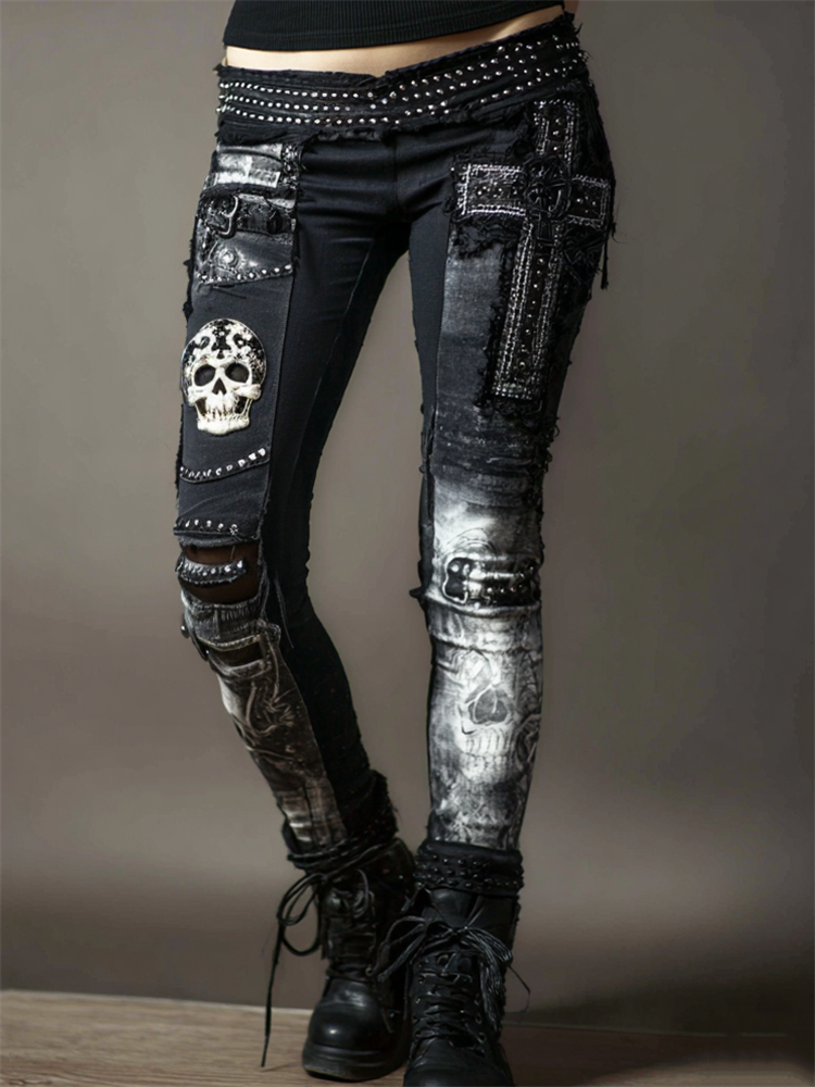 Rock Skull Cross Studded Patchwork Washed Comfy Leggings