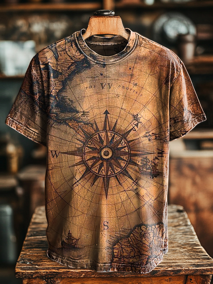 Unisex Retro Compass Print Casual Loose Short Sleeve T-Shirt