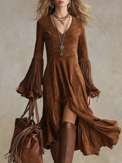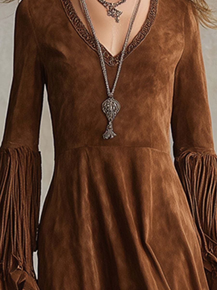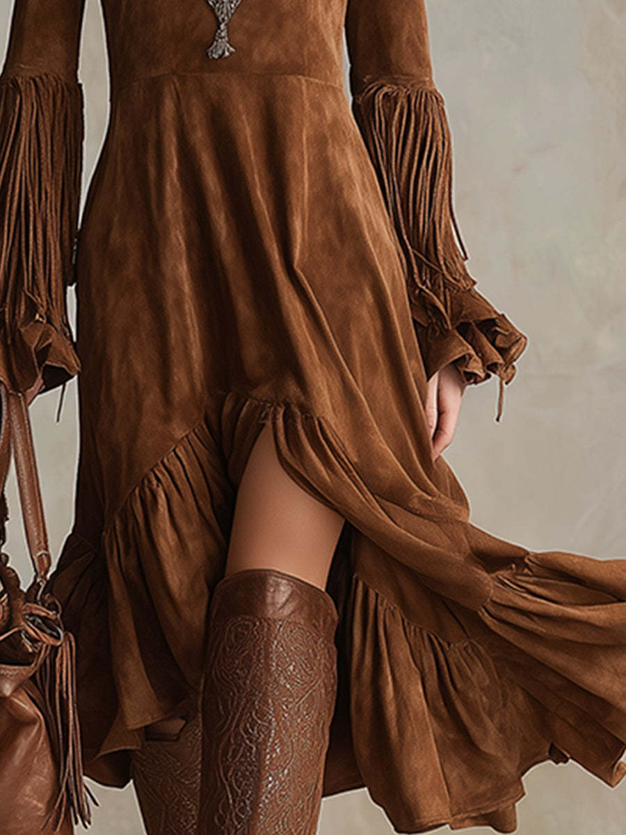 Vintage Bohemian Brown Faux Suede Cuff Tassel Midi Dress