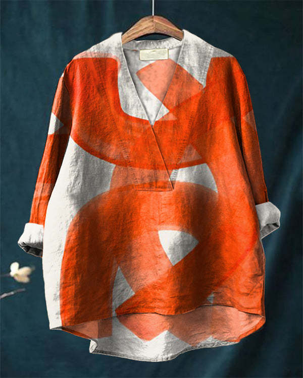Vintage Orange Abstract Art Print Loose V-Neck Cotton and Linen Shirt