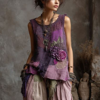 Vintage Purple Roses Lace Patchwork Linen Tank Top