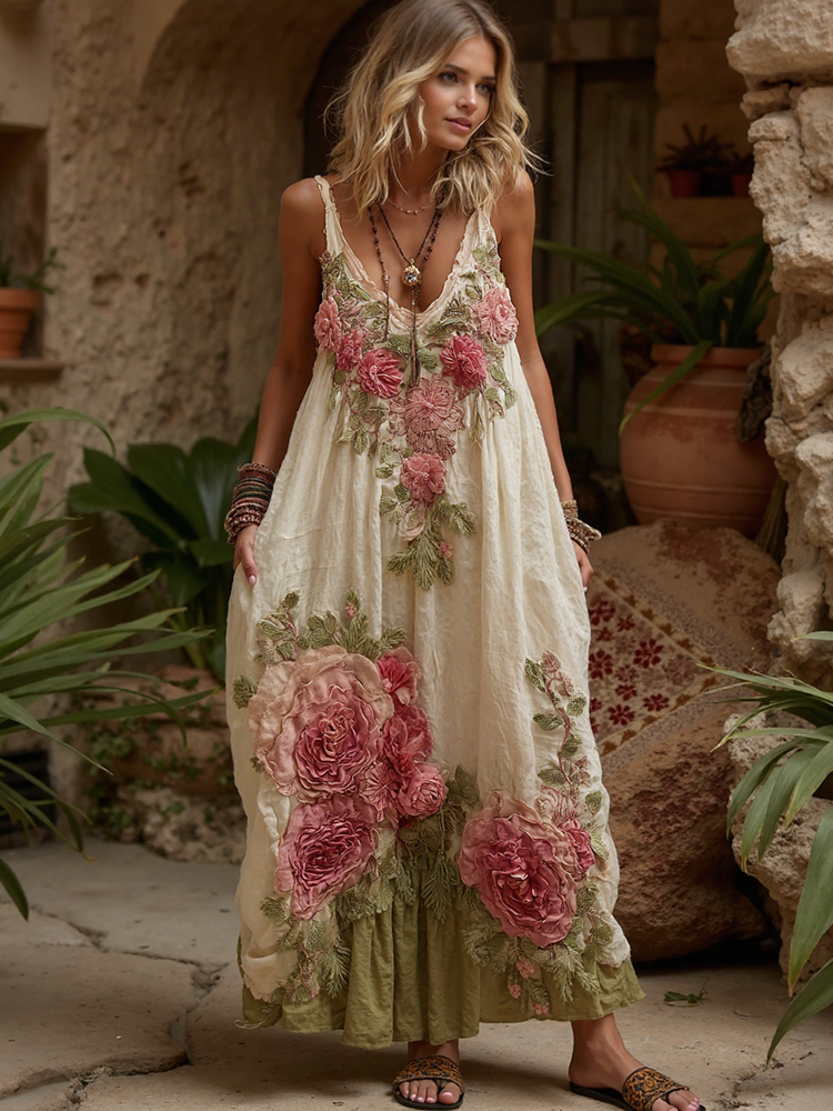 Women Vintage Floral Embroidery Art V Neck Linen Maxi Dress