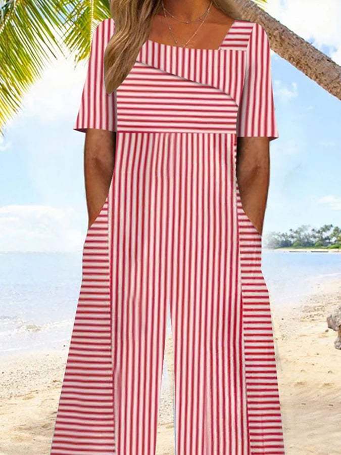 Women's Casual Red Striped Short Sleeve Jumpsuit