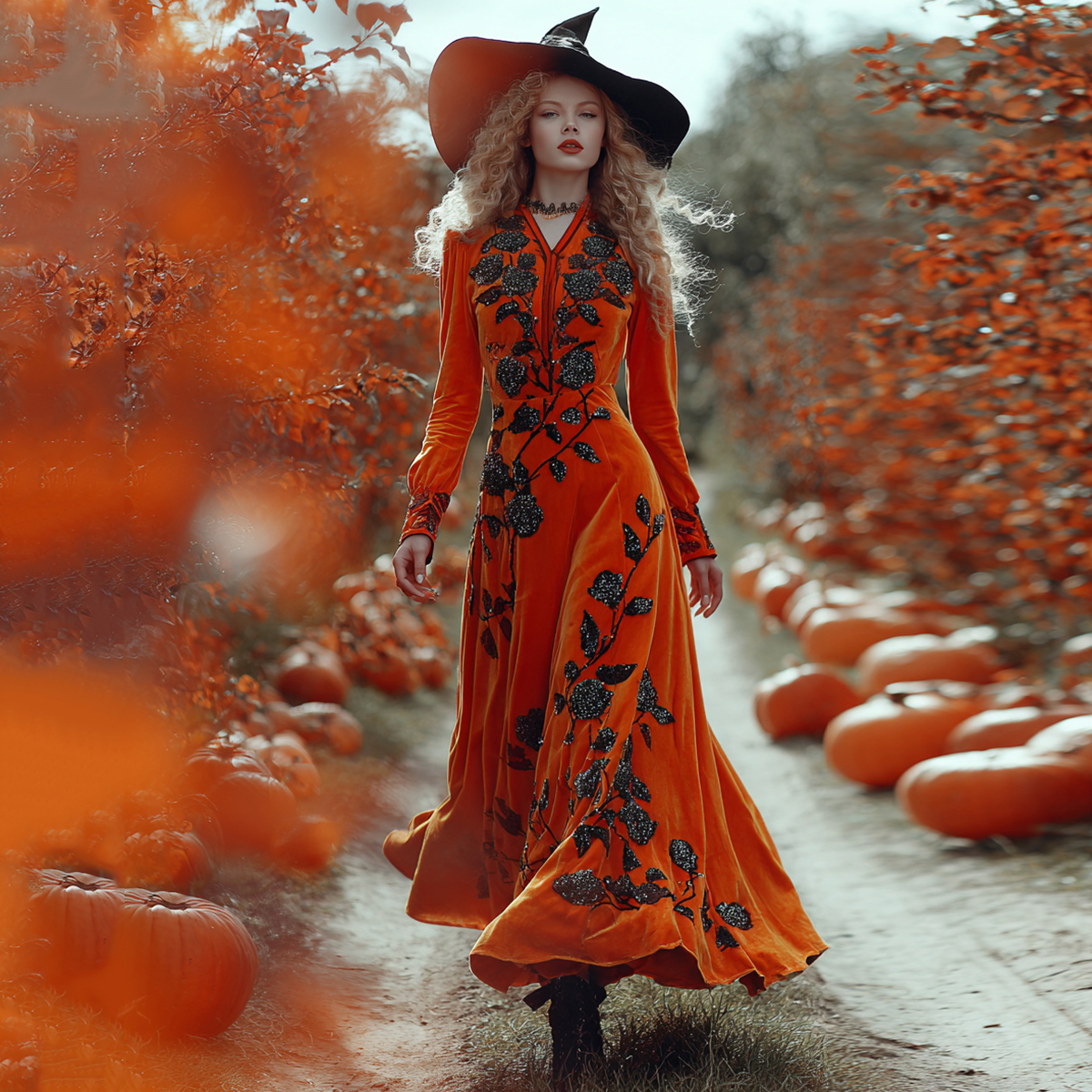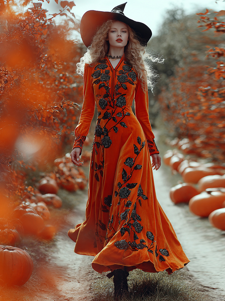 Women's Classic Floral Pumpkin Halloween Art Comfy Velvet Maxi Dress