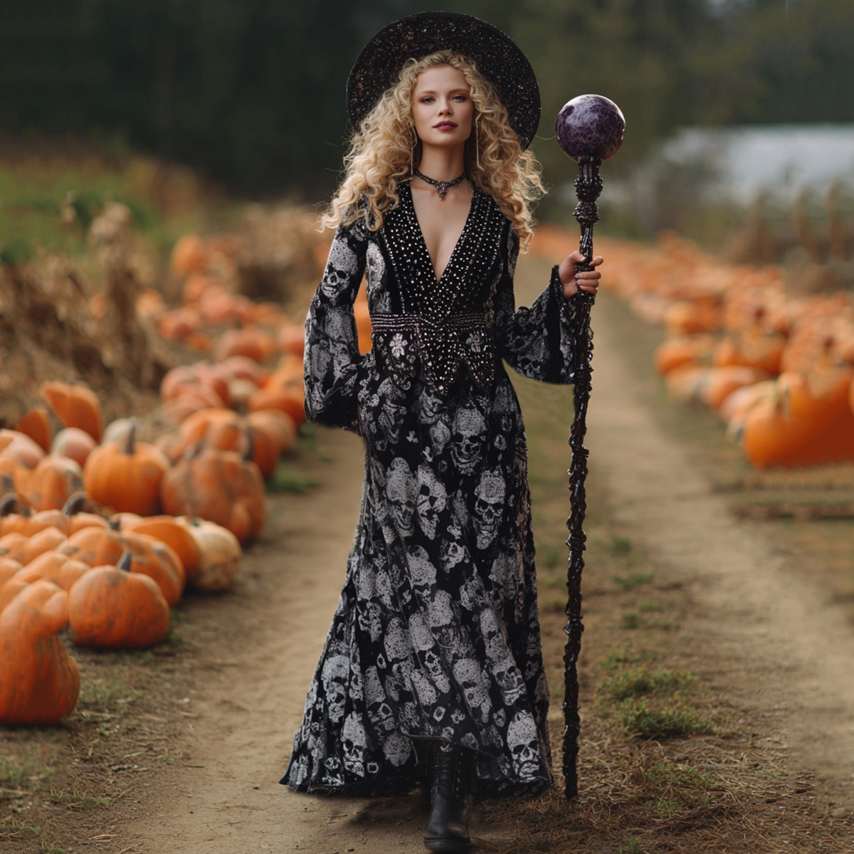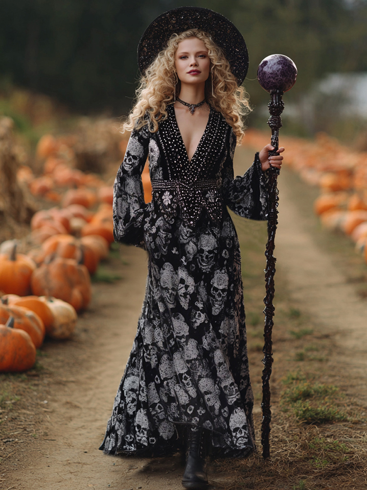 Women's Classic Halloween Skull Art Comfy Velvet Maxi Dress